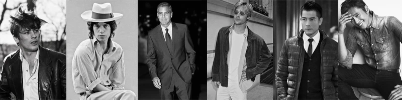《Timeless Icons》影像書男士版本的名人包含了(左至右):亞蘭德倫(Alain Delon)、米克傑格(Mick Jagger)、喬治克隆尼(George Clooney)、布萊特彼特(Brad Pitt)、郭富城、李秉憲(Byung Hun Lee)等。