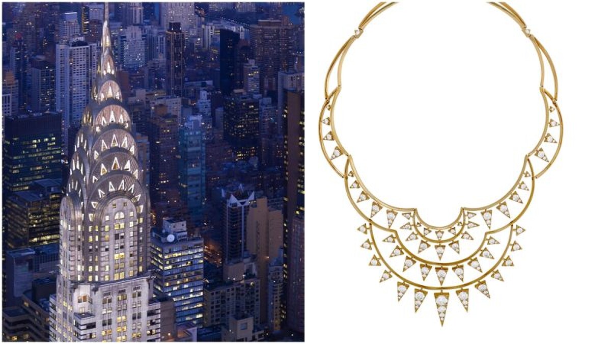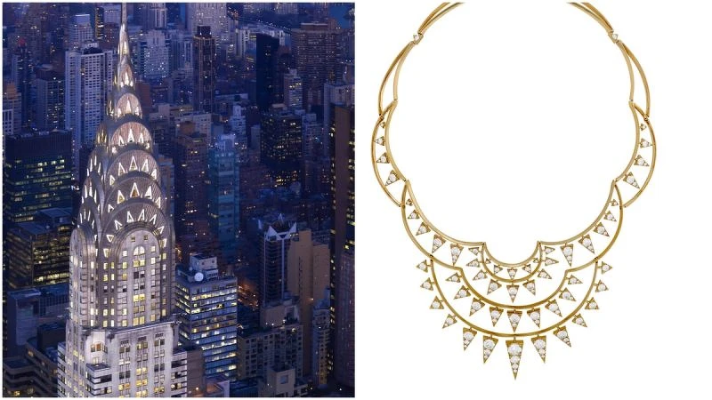 在紐約人心中,最具代表性、及裝飾藝術風格的摩天大樓非克萊斯勒大廈莫屬:頂端共有七層圓弧加疊,每一層皆由寬至窄向內縮進,創造超出實際高度視覺震撼,在紐約天際線中脫穎而出。設計師Ilaria即運用此概念以黃K金圓弧線條打造,並在三角形尖端鑲嵌「全世界車工最完美的鑽石」向四周迸射光芒,就如同克萊斯勒大廈由內而外散發的都會光影。