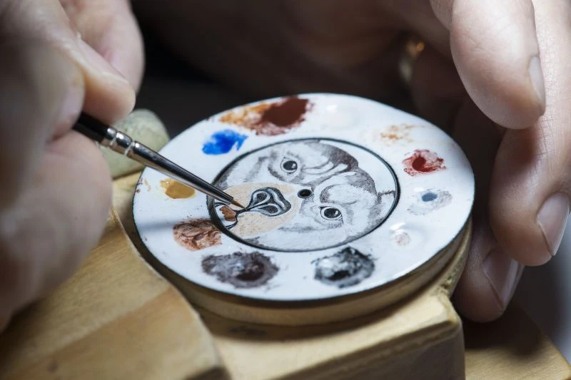 每一種顏料被塗滿在白金錶盤上時,清晰的筆劃都讓動物的表情變得更加深邃,製作琺瑯錶面時,每一層的乾燥和焙燒階段不能削薄,在工匠精緻的錘煉下,讓彩繪出來的圖案更靈動又充滿趣味。
