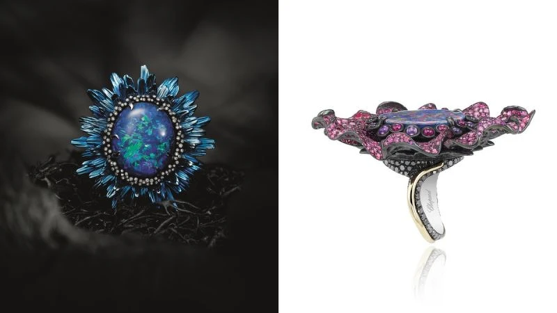 值得一提的是,被西方譽為十月生辰石的蛋白石(Opales)與鑽石同為最美麗的寶石,這個從黑森林裡躍然而出的是9克拉橢圓黑蛋白石,主石外鑲嵌著一圈艷色火紅的花瓣,就如同炫麗的花朵跨入這個神秘奇幻的想像之中。而另一個花園主角就是來自總裁兼創意總監發想的動物王國,以38顆14.14克拉花式切顆彩鑽、858顆花式切割粉紅鑽、247顆花式切割黃鑽與23.94克拉白鑽,2顆心型黃鑽打造的蝴蝶胸針,細緻而充滿工藝技術的作品,也著實令人更期待蕭邦這次在台灣展出的珠寶實力。