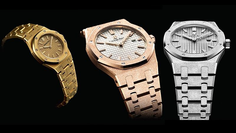 左圖是由賈桂琳・蒂米耶(Jacqueline Dimier)1976年所設計的首款皇家橡樹女錶;中間及右圖是新登場的Frosted Gold霜金錶18K玫瑰金款與18K白金錶款,有33毫米與37毫米兩種尺寸。