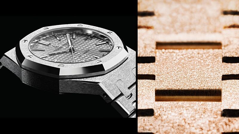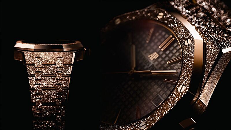 為打造和此經典錶款相互呼應的精緻細節,愛彼特別邀請義大利珠寶設計師卡洛琳娜・布奇(Carolina Bucci)一同合作,以古老的佛羅倫斯技術,為全新推出的Frosted Gold霜金錶款加入迷人的閃耀元素。經過不斷的嘗試與調整,卡洛琳娜・布奇旗下的珠寶工藝匠師與愛彼錶廠的製錶師,終於成功將傳承已久的古老黃金錘擊技法運用於錶款上,貴金屬表面上精修處理細微的凹痕,透過光線折射出如寶石般微光粼粼的閃爍效果,其細膩表現,媲美皇家橡樹系列腕錶錶殼與錶帶上,經典獨到的拉絲與拋光工藝所打造出的華美極致光燦。