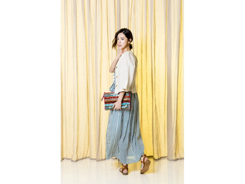 米白色七分袖短外套、條紋長洋裝、多彩亮片刺繡手拿包、彩球裝飾平底涼鞋,all by PENNYBLACK