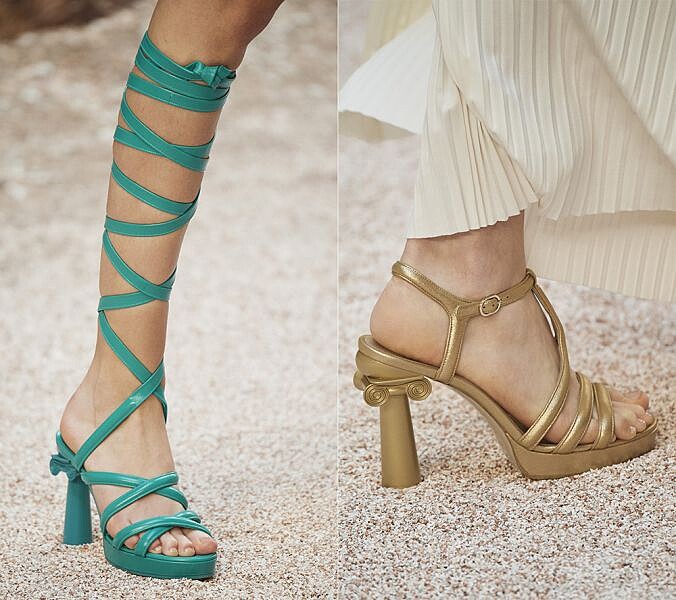 宛如古羅馬戰士般的綁帶鞋貫串了整個系列,其中除了改良版的短靴,高跟涼鞋則是以石柱造型鞋跟打造,成功製造新一季的風格話題。