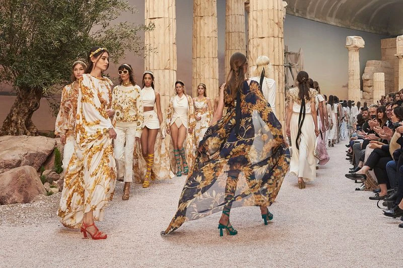 垂墜的浪漫線條、隨步伐而起的服裝律動,開場幾套以斜紋軟呢打造的造型,不僅重申品牌的經典元素,也切合這次的主題,開展出全新的模樣。袖口與裙襬的抽鬚處理,腰身運用編繩隨興紮起,象牙白、淡褐與如陶土色澤般的磚紅,都恰恰呼應了希臘文明場景的基礎色調。大量的雪紡與絲緞材質應用,同樣是這個系列當中不可錯過的一大重點。.jpg)