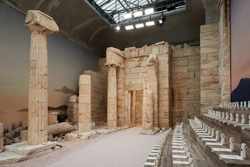 位於大皇宮的弧形長廊成了時空之門,黃色砂礫地面、如神殿般的雄偉石柱、搖曳生姿的橄欖樹也平行位移,在這巴黎的一處落腳。古希臘文明不僅是這個早春系列的靈感起點,也是文藝復興與現代美學發展的基礎。也許,大皇宮染上了古老時代的塵埃,但當模特兒大步躍上伸展台的那一刻,才是真正讓整個場景生動了起來。