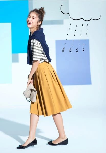 擁有快乾機能的DRY彈性打褶裙,非常適合雨天穿,可挑選較鮮豔的黃色,再搭配流行的條紋T恤,展現亮眼的活力風格。有防曬習慣的女孩也能在肩膀披上抗UV開襟外套抵擋紫外線。