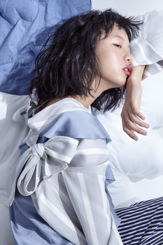 柔和色調的寬條紋配上絲滑觸感的荷葉邊感受最適合來場睡眠旅行。