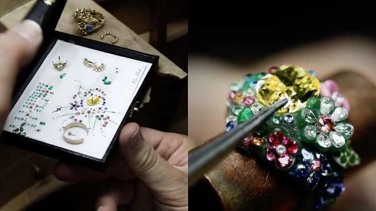 在色彩上,Versailles, côté Jardins系列將花園中的繽紛斑斕轉化在作品創作,如罌粟紅、水仙花黃色、橘紅色、嫩綠的草坪、牡丹粉紅色與勿忘我藍。透過這些感性迷人的色彩,彰顯出蹂合在凡爾賽宮庭花園的正統經典美學,和巴洛克式那無邊境的幻想國度。最後以品牌獨家的精湛工藝和結合不同技術的鑲嵌功法,凸顯出寶石自身的璀璨光輝,同時強調出作品的圖形細節。