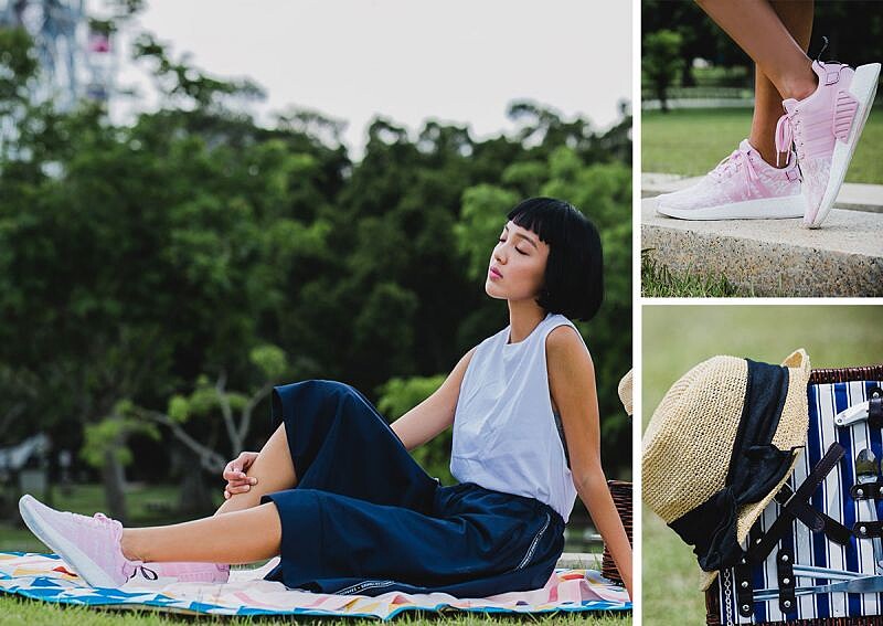 清新自然風的穿搭重點,在於色系搭配及挑選單品的小細節,兩側挖低的極簡設計坦克白洋裝,搭配NMD首次推出的同名系列深藍色寬裙,簡約的藍白色組合,營造出乾淨自在的好女孩風格,下半身就讓如草莓奶昔般可愛的雪紡粉紅NMD_R2點亮全身焦點,只是融入微量的甜美色,就能增添一絲浪漫氛圍。