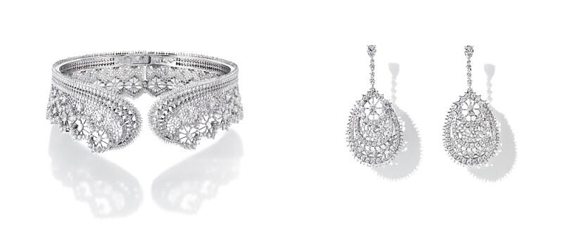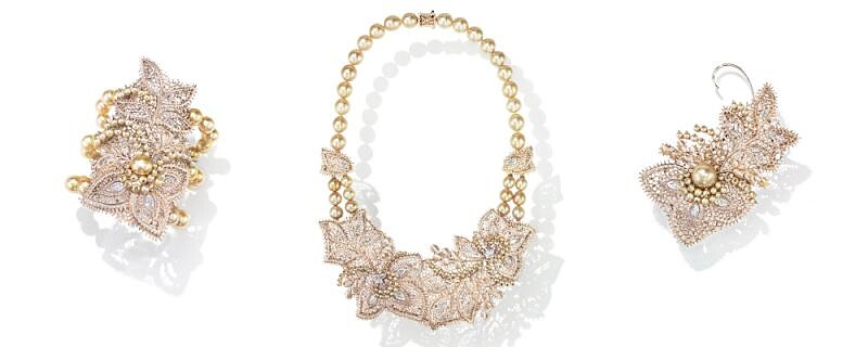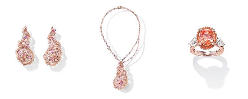 這一套繁複做工的系列,以香檳色調和玫瑰色的櫻花金(TASAKI獨家開發的金性),搭配上對比的帕德瑪藍寶石來展現其深邃度,在透過自身的反射與折射,呈現鏤空花邊的精細工藝,彷彿是從古老的粉紅色蕾絲花邊上剪下來一般逼真!