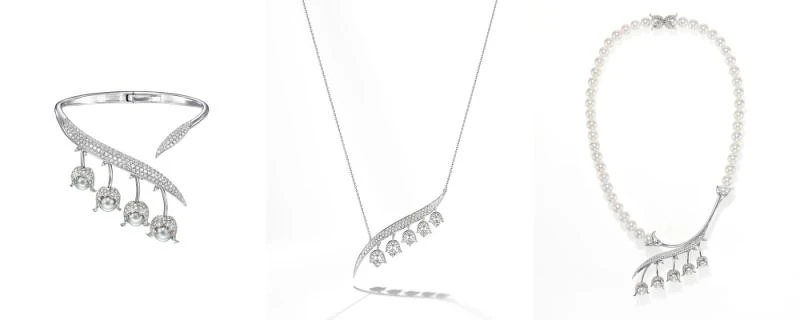 Chorus Valley系列描繪擁有細長葉子的純白鈴蘭的綻放設計,彰顯生動活潑姿態!無論是綴滿圓形明亮式切割鑽石,或是當中幾款鑲嵌上TASAKI獨家研發的refined rebellion優雅叛逆的切割鑽石與珍珠,共同描繪出鈴蘭花葉那股嬌貴生機。