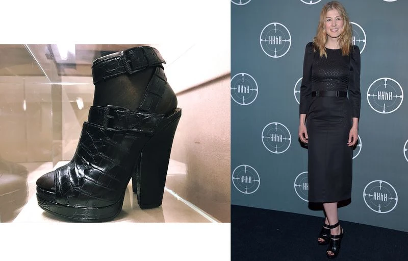 帶有方形楦頭的鞋履,搭配厚實的鞋跟設計、以及小巧的幾何圖案,展現多樣化姿采,鱷魚皮雙釦環涼鞋是本季的必備鞋款( 右圖:電影”控制”女星羅莎蒙派克穿著BV17秋冬洋裝及該鞋現身在電影”HHHH”巴黎首映會)