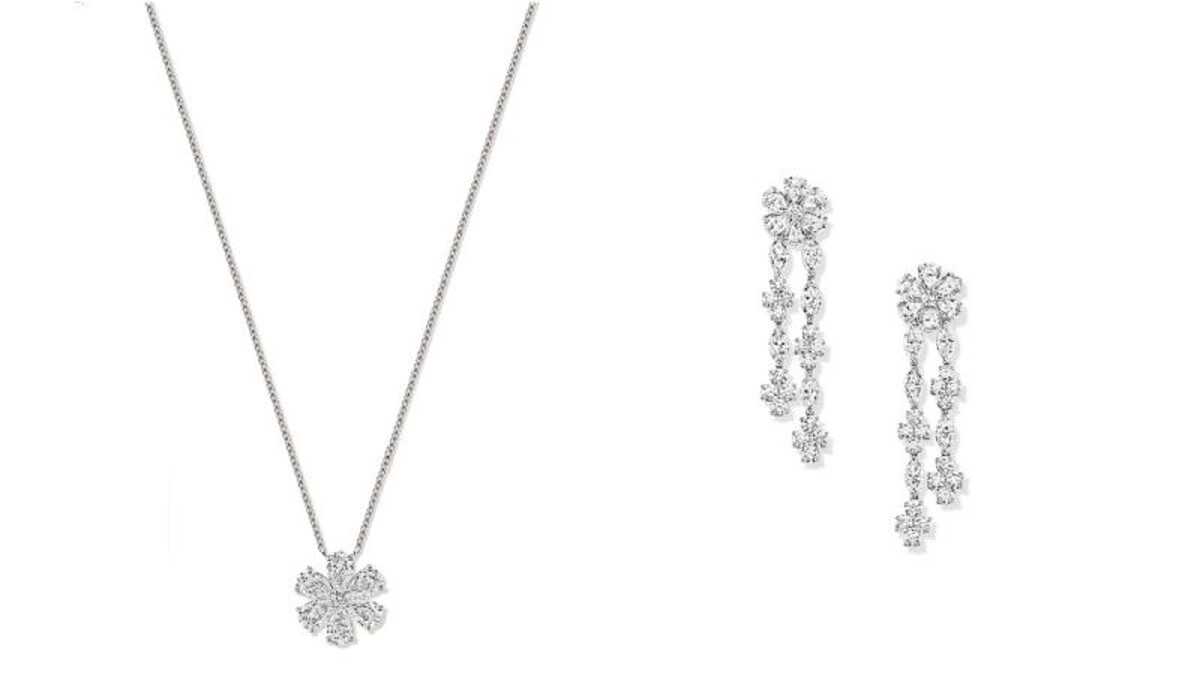 (圖左)海瑞溫斯頓勿忘我FORGET-ME-NOT鑽石墜鍊、(圖右) 海瑞溫斯頓勿忘我FORGET-ME-NOT鑽滴耳環