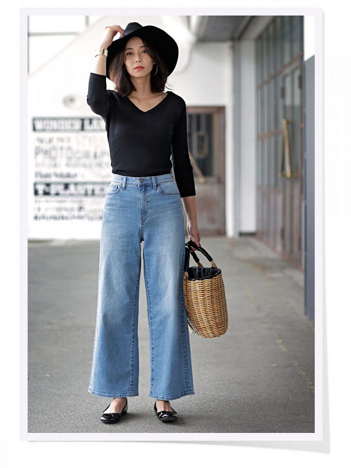 以高腰寬版牛仔褲作為穿搭主角,並以簡約的黑色單品穿出時髦的法式風格,一年四季都受喜愛的牛仔褲,只要善於運用搭配,就能創造出不同的穿搭感。由於寬褲較為寬鬆,因此上半身記得挑選貼身的款式,才能穿出平衡的視覺效果。