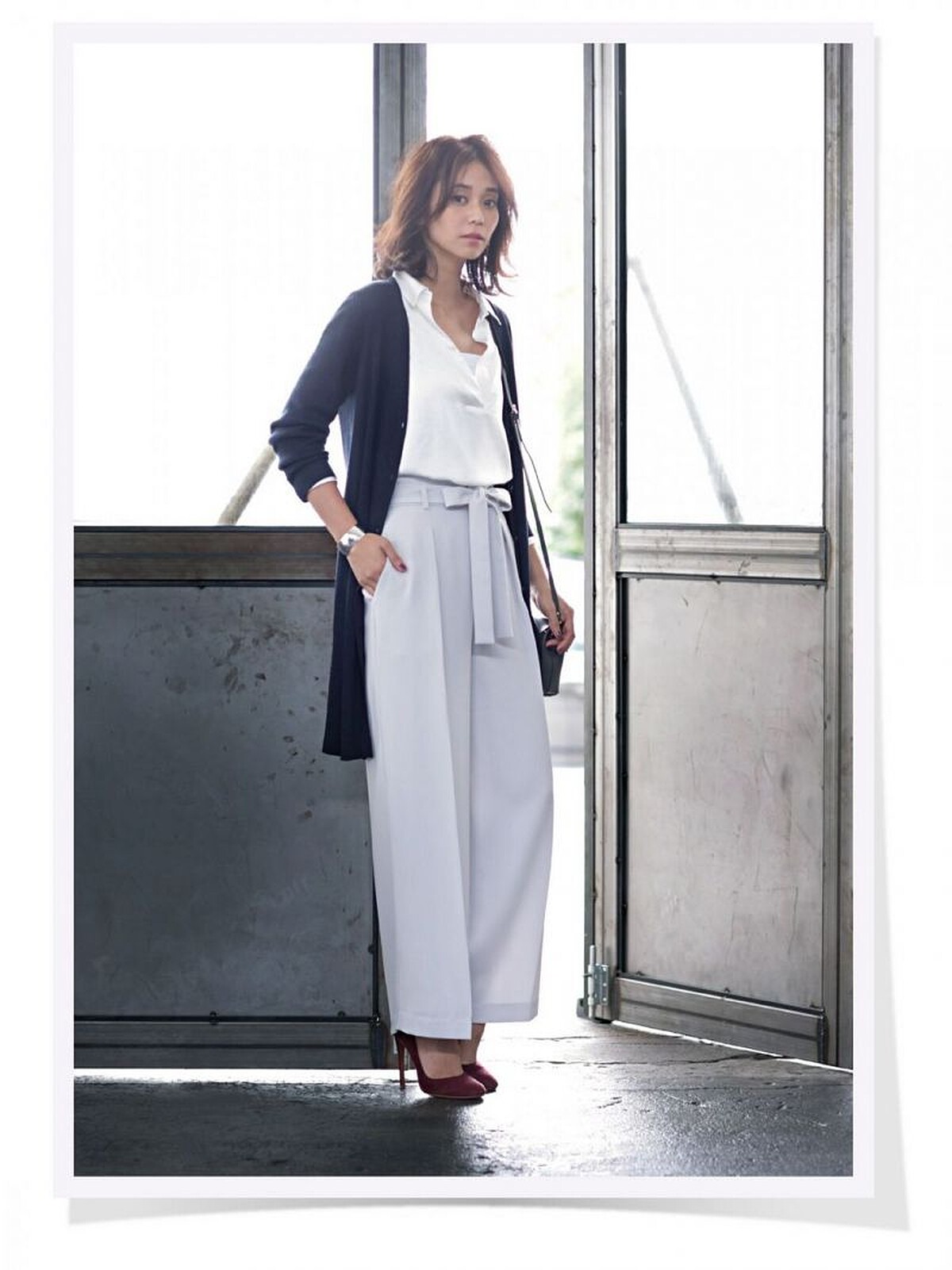 白色開領上衣搭配灰色高腰緞帶寬褲,能夠創造出白到淺灰的漸層感,造型充滿女人味,這時可額外加入深藍色的長版開襟外套,讓整體造型多一份俐落感,且拉長視覺效果,高腰褲上的蝴蝶結不只充滿巧思,也能讓視覺更集中,是創造好比例的關鍵之一。