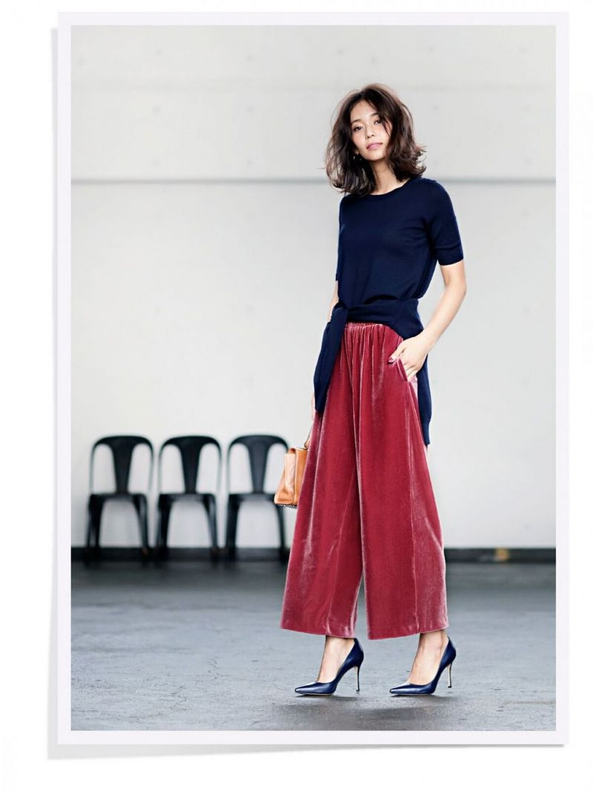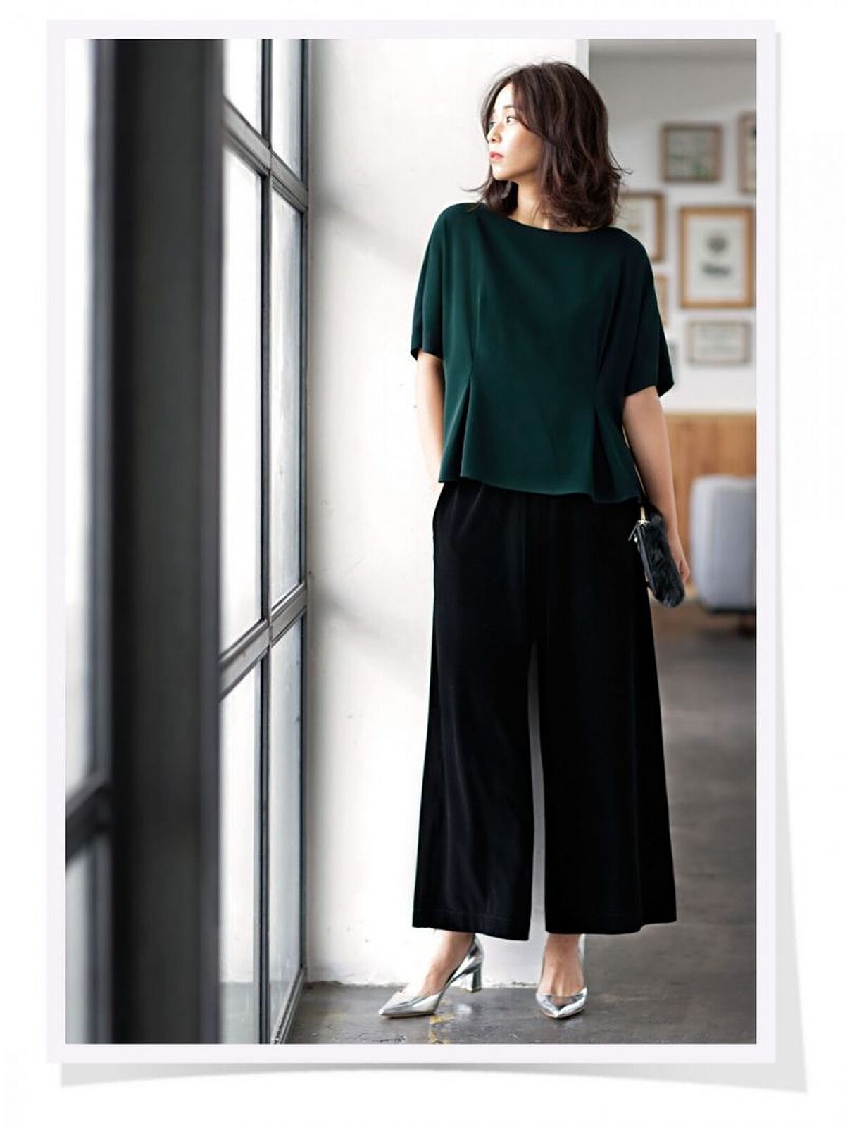 具實搭性且季節感十足的黑色絲絨寬褲,只要搭配同樣具有沉穩風格的垂墜風打褶上衣,馬上完成適合正式場合的氣質造型!同樣都以深色系做為搭配,但透過材質的混搭就能讓造型不過於沉重單調,時髦滿分!