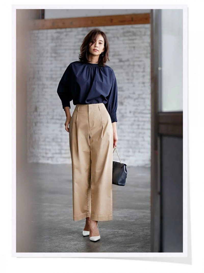 亮眼的卡其寬褲,搭配優雅的藏青色抓皺上衣,就打造出高雅成熟風格,當下半身單品選擇淺色系時,上衣可搭配深色單品,能夠平衡整體視覺效果,讓比例更佳。