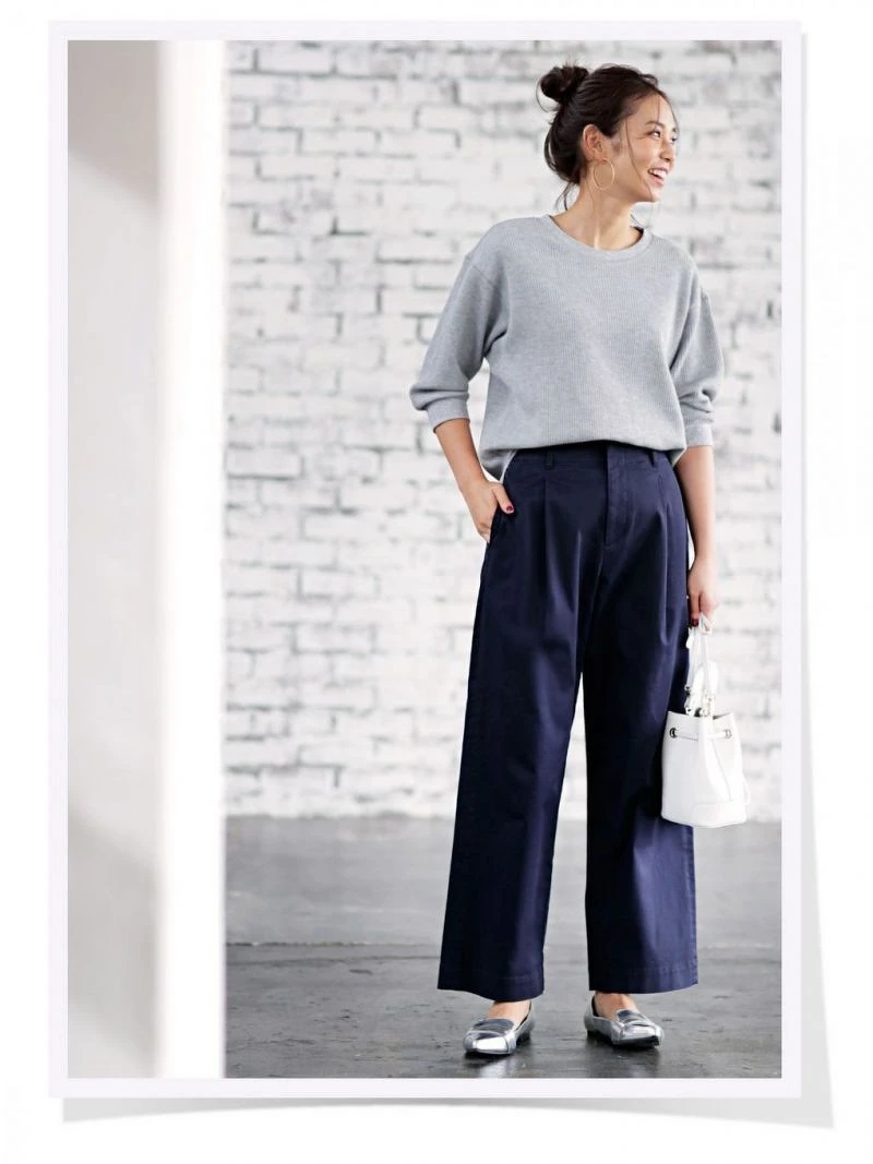 如果不喜歡淺色系的下半身單品,則可挑選藏青色的下半身,並搭配百搭的灰色華夫格圓領T,即使皆為素色仍能穿出流行感,特別是初次嘗試寬褲的入門者,利用基本色系較不容易出錯喔!