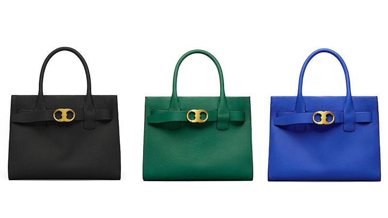 GEMINI LINK托特包($27,900)以方正俐落的外型成功擄獲上班族女性的心,落落大方又不失時尚型格,標誌性的雙子星扣環,代表著設計師TORY的星座以及她的一對雙胞胎兒子,沉穩飽和的藍、綠、黑色調搭配柔軟荔枝皮革材質,彰顯出包包的低調奢華美感。