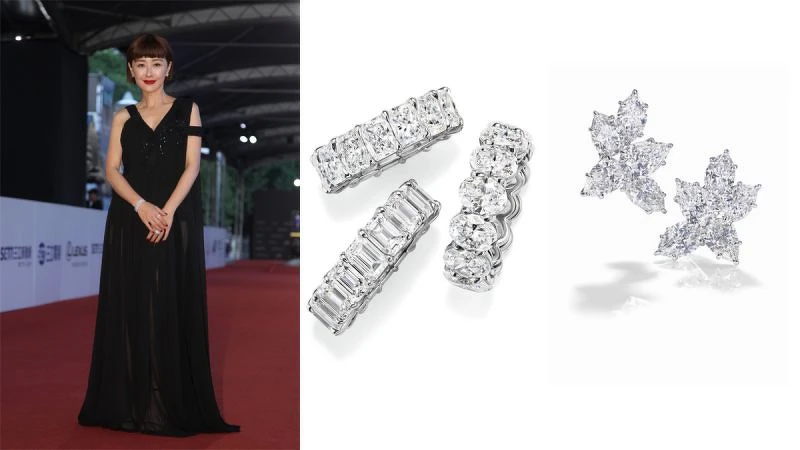 入圍本屆金鐘獎「益智及實境節目主持人獎」的李維維以一襲典雅的黑色長禮服現身紅毯,俐落貼耳的海瑞溫斯頓經典錦簇系列Winston Cluster鑽石耳環搭配俏麗短髮,再搭配Lily Cluster鑽石鉑金手鐲、橢圓形鑽石線戒以及鑽石戒指,全身珠寶總價高達一千三百萬元,舉手投足間璀璨奪目。
