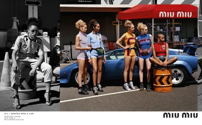 陽光灑落在法國的一座賽車場地上,跑道旁圍觀的女孩們一起欣賞這場疾速飛車,身上穿著一系列融合汽車與典型男性主義元素的混搭服裝,上頭裝飾了徽章、賽車條紋線條,搭配色彩繽紛的炫麗珠寶,還有結合賽車手制服的女孩運動連身褲、鉚釘裝飾夾克和標誌貼片,就連Miu Miu新系列的matelassé包款與太陽眼鏡都受到賽車啟發,《All I wanted was a car》這系列無庸置疑創造了18早春的帥氣女孩風格!