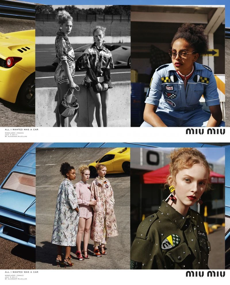 Miu Miu 早春2018廣告大片系列在位於法國的賽車場地Autodrome de Linas-Montlhéry進行拍攝,呼應Miu Miu早春大秀於歷史上首間汽車俱樂部Automobile Club de Franceem舉行的主題,融合了汽車及典型男性主義的元素(如裝飾徽章和賽車條紋線條的搭配),展現趣味混搭。