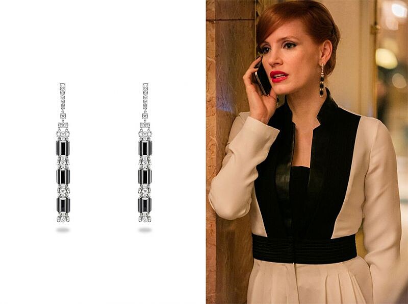 火光搖曳的鑽石與黑色尖晶石交錯而成的流蘇線條,以現代珠寶工藝把玩裝飾元素,看似隨意卻是精心安排的佈局,讓光影的流轉在每個角度都臻至完美。潔西卡雀絲坦也在電影《攻敵必救》中一場與敵方攻心鬥智的晚宴中配戴入鏡。