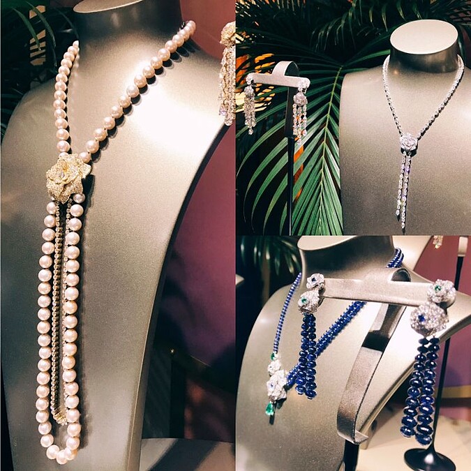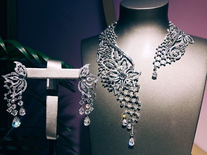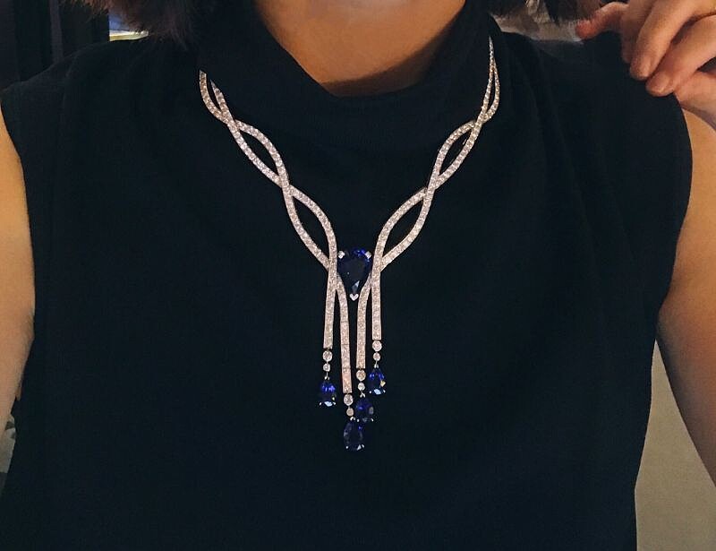 試戴的是鑲嵌單顆來自斯里蘭卡的梨形切割藍寶石(近22克拉)、4顆來自馬達加斯加的梨形切割藍寶石(15克拉)及357顆圓鑽,總價三千六百萬元,全球限量1件,秒懂戴著一幢豪宅的感覺,沉沉的。