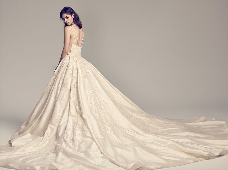 使用高級訂製服品牌Zuhair Murad指定的義大利蕾絲品牌,如同貴氣金箔的頂級蕾絲,搭配手工縫製的施華洛世奇亮鑽襯托出極致透膚效果,搭配立體剪裁的壓摺裙擺,使用了多達400碼的網紗(幫大家換算一下:3碼的布量可以做一身西裝外套),裙擺拖尾長度超過5呎,層層堆疊出份量及立體感。