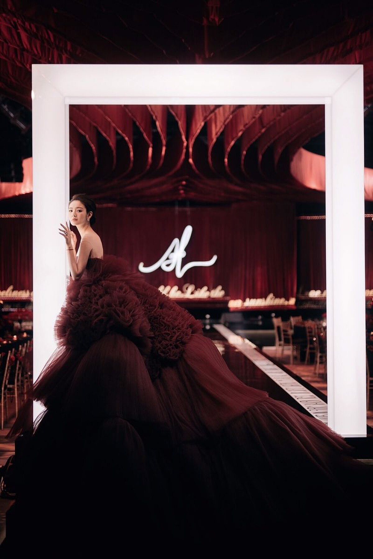 這件可以說是品牌精神的化身!使用了頂級的義大利泰絲,點綴華美的珍珠及水晶亮鑽勾勒出華麗細緻的幾何圖形,工匠們耗時上千小時的精心縫製,以泰絲獨有的光澤質感帶出氣質華美的氛圍,搭配性感美背設計及氣勢的典雅蓬裙,每一個角度都絕美動人!