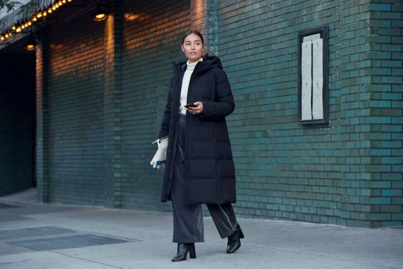 時尚業界是不畏風雪都要持續工作的,身為超人氣的時尚造型師Rachael,不管何時都會不斷地收到各界的時尚活動邀請,如果想在寒冷的天氣展現優雅俐落感,就選擇永不退流行的黑色吧,帶點光澤感,又可展現女性氣質的無縫羽絨長版大衣,穿上它帥氣地穿梭各個活動現場。