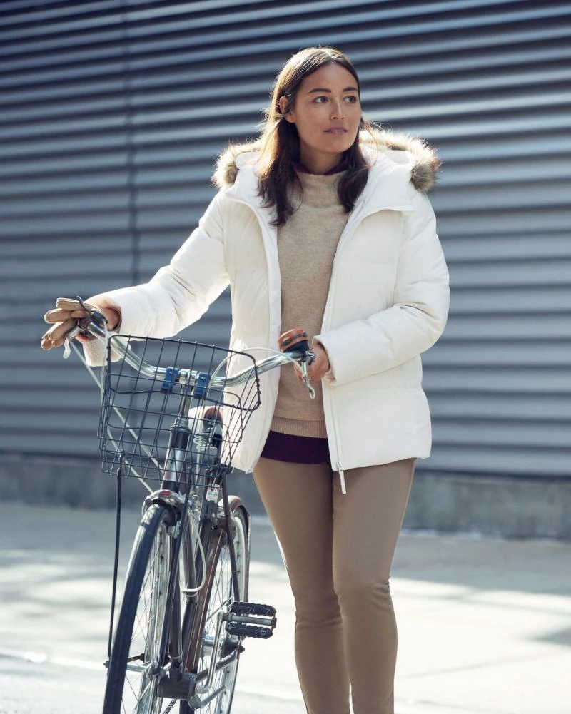 Rachael平常假日喜歡騎著單車到處去,穿著長度適合騎單車又方便活動的純白色無縫羽絨外套,整體以柔和色調的米色提升高級感,且附毛皮的帽子更增添了可愛感,帽子還能再騎車時防風。