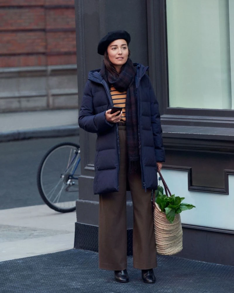 就算是休假也要注意外出服裝的時髦度,為了穿出活用顏色對比的造型,選擇可以襯托出海軍藍無縫羽絨短大衣的配件,走在平靜午後的傳統時尚,依舊散發出滿滿的魅力。