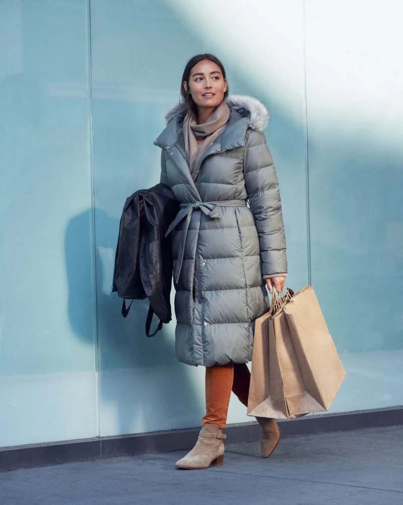 在攝影開始前,Rachael花了好幾個小時在街上到處跑,蒐集樣品、首飾和配件。附有同布料的腰帶的輕型羽絨連帽大衣,可輕鬆顯現女性線條,展現出好氣質,並且附皮毛的帽子還能防範降雪。