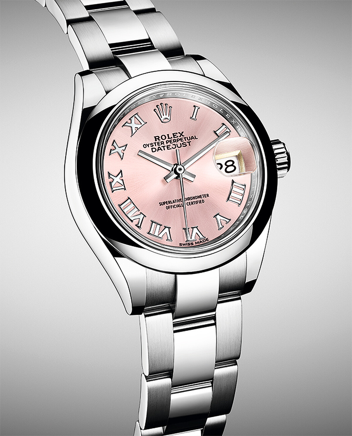 自1945年以來,Datejust(蠔式恒動日誌型)系列一直是優雅風格與精準時計的代名詞。於二十世紀晚期問世的Lady-Datejust是Datejust系列的首款女裝錶,它將Datejust的高雅氣質與獨特功能凝聚在一個小巧玲瓏的錶殼裡,更適合女性纖細的手腕。Lady-Datejust 28的蠔式錶殼保證防水100米,是堅固優雅與完美比例的典範。形狀獨特的中層錶殼以整塊實心904L鋼鑄造而成。鏡面則以藍水晶製造,不易刮損。3點位置設有小窗凸透鏡,方便讀取日曆。