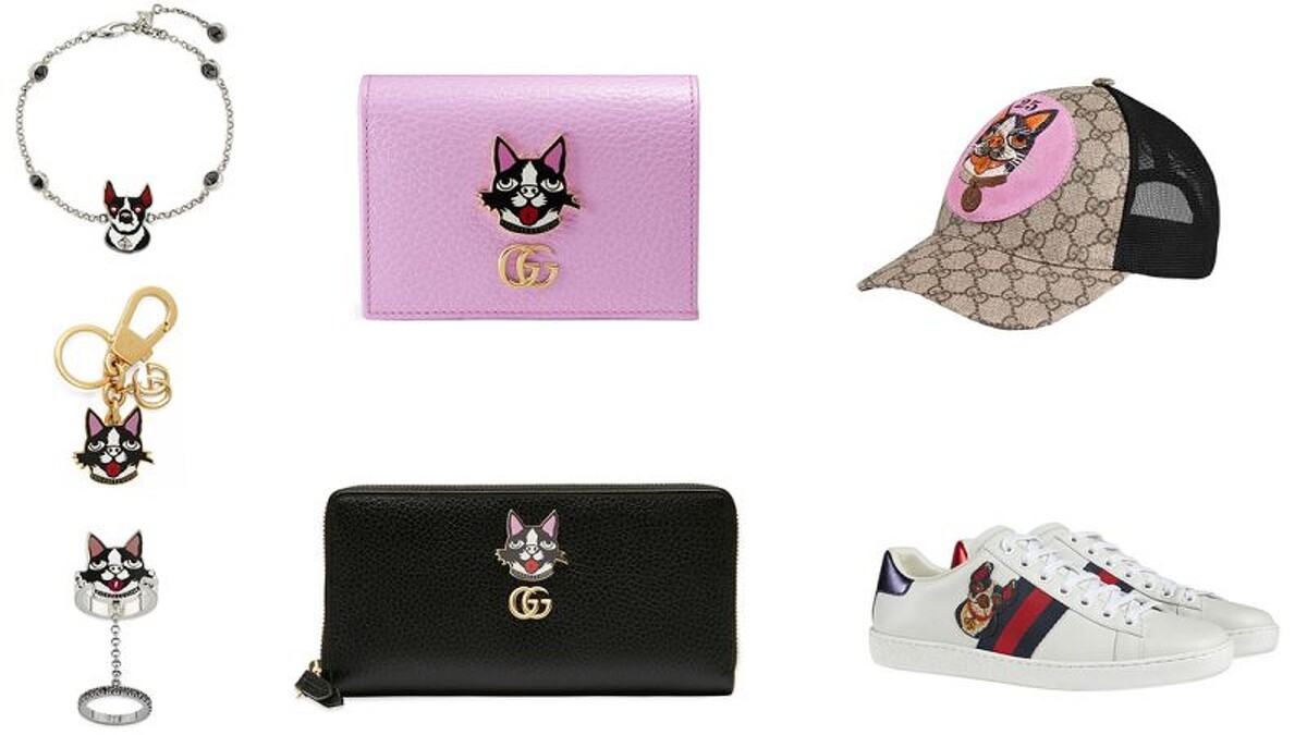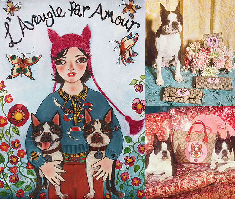 Gucci 2018農曆新年限定的小狗圖案,靈感來自於藝術家 Helen Downie, 又稱 Unskilled Worker 送給 Gucci 創意總監 Alessandro Michele 的畫作。畫作裡 Alessandro Michele 抱著他心愛的兩隻波斯頓犬 Bosco 與 Orso,沉浸在 “L'Aveugle Par Amour 執迷於愛” 的幸福浪漫花團中。