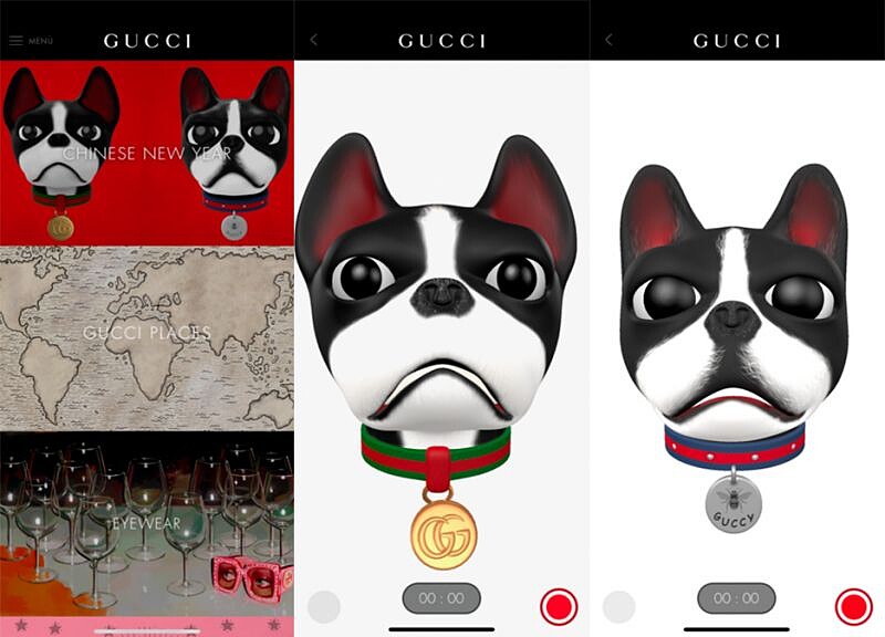 此外Gucci超生動的新春獻禮還不止這些!Gucci App 也設置了 iPhone X 專屬互動程式,透過特殊的臉部辨識技術,兩隻波斯頓犬能栩栩如生的展現使用者表情,並能錄製影片分享年節祝賀。