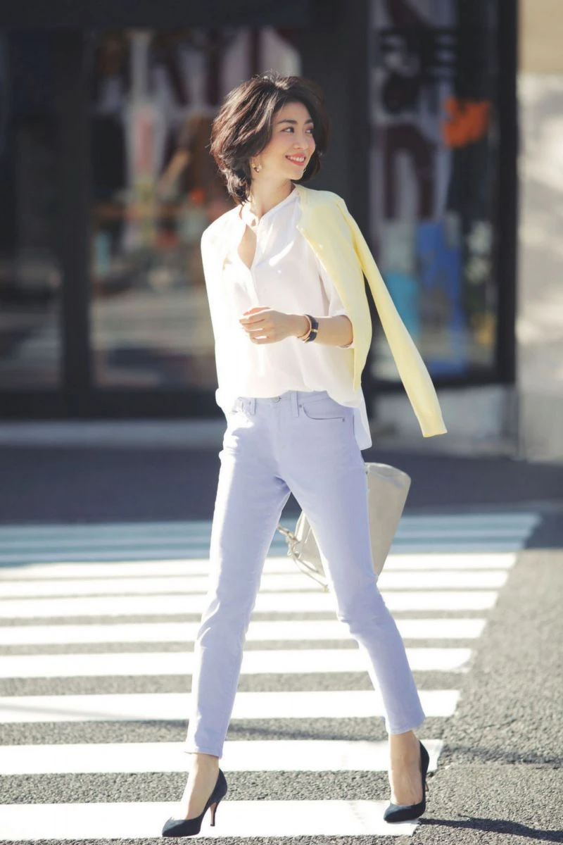 優雅的粉嫩紫,配上清爽的淺藍色襯衫或上衣,前方紮進腰部、再披上外套就完成成熟穿搭,另外像是鵝黃、粉紅、淺綠等粉嫩上衣,都可以自由搭配,展現清新休閒穿搭!