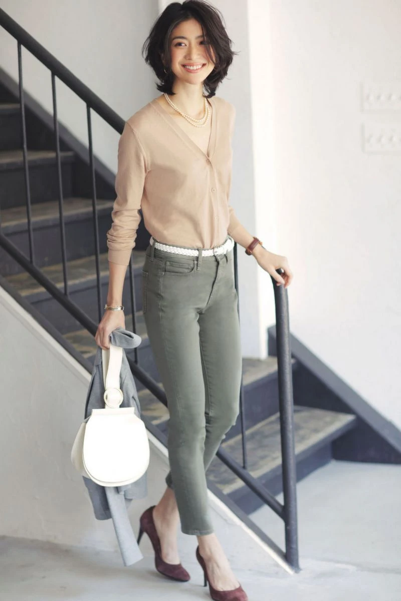如果喜歡運動風,可以搭配白色布勞森外套與灰色T-shirt,軍綠色會比藍色牛仔褲更具個性;喜歡大人風的話,搭配V領針織衫,內搭選擇同樣色系的淺色搭配,以軍綠牛仔褲做為視覺焦點,看起來充滿女性魅力。