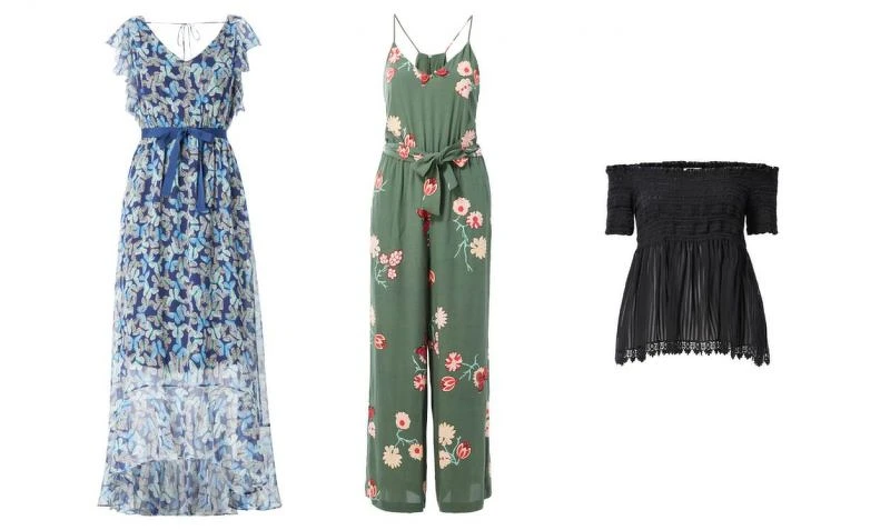 (由左至右)夢幻蝴蝶浪漫純絲洋裝NT 22000/和風印花復古綠連身褲NT 14600/荷葉邊優雅露肩上衣NT 11400
