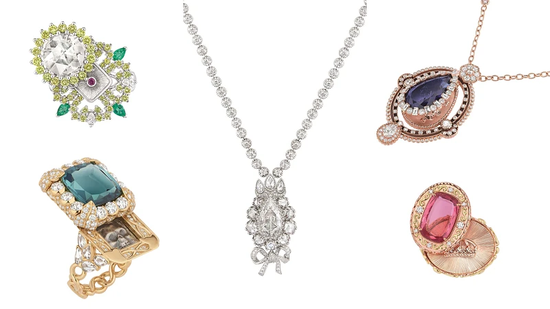 當中那機械般的工藝、與精湛的雕刻技術都在巴黎最頂尖的高級珠寶工坊中完成,只為重現凡爾賽宮之夢的全新生命。Victoire表示:「我想透過有著明暗效果的寶石手法來呈現,褪色的玫瑰紅、泛有紅色邊陲的紫色、閃爍螢光的月光石與彩度更飽和的天空藍,來呈現寶石的明暗對比。色彩本身看起來有點神祕,如同古老的絲綢一樣。」
