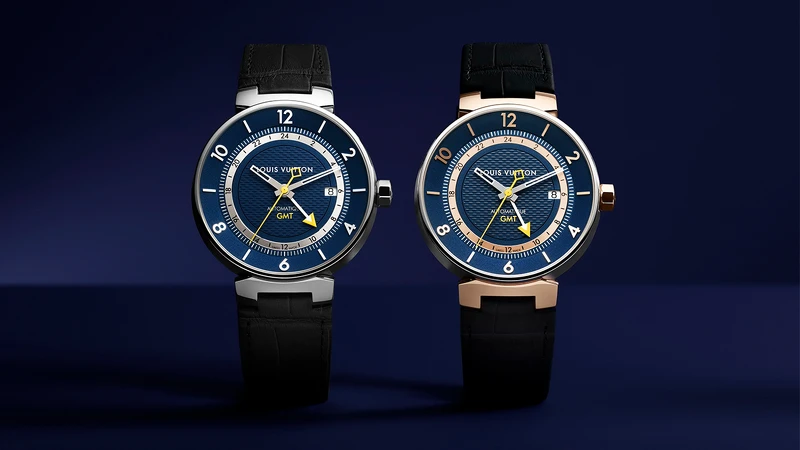 男款的腕錶雖然沒有Monogram花卉,卻有著來自Damier帆布的紋路!搭載GMT功能、計時碼錶、陀飛輪等實用功能,仔細看,錶盤上顯眼的黃色其實正是Louis Vuitton傳統的皮件縫線色彩,在這則用來強調額外功能、第二時區、或計時碼錶,向Louis Vuitton的旅遊熱情致敬。