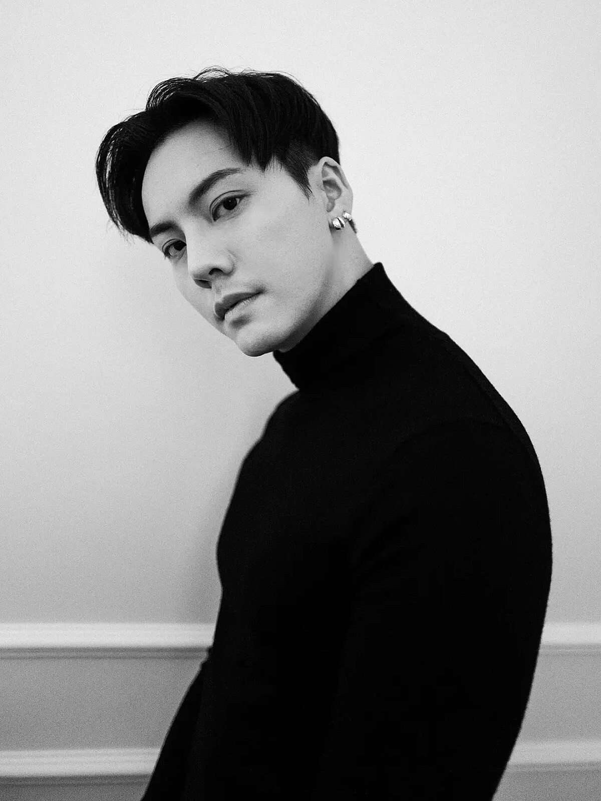陳偉霆頭戴白色針織帽,身穿黑色羊毛雙排扣夾克,內搭白色T恤,下穿黑色水洗緊身牛仔褲,腳踩白色球鞋,極簡黑白風精緻又瀟灑,復古現代玩酷混搭。