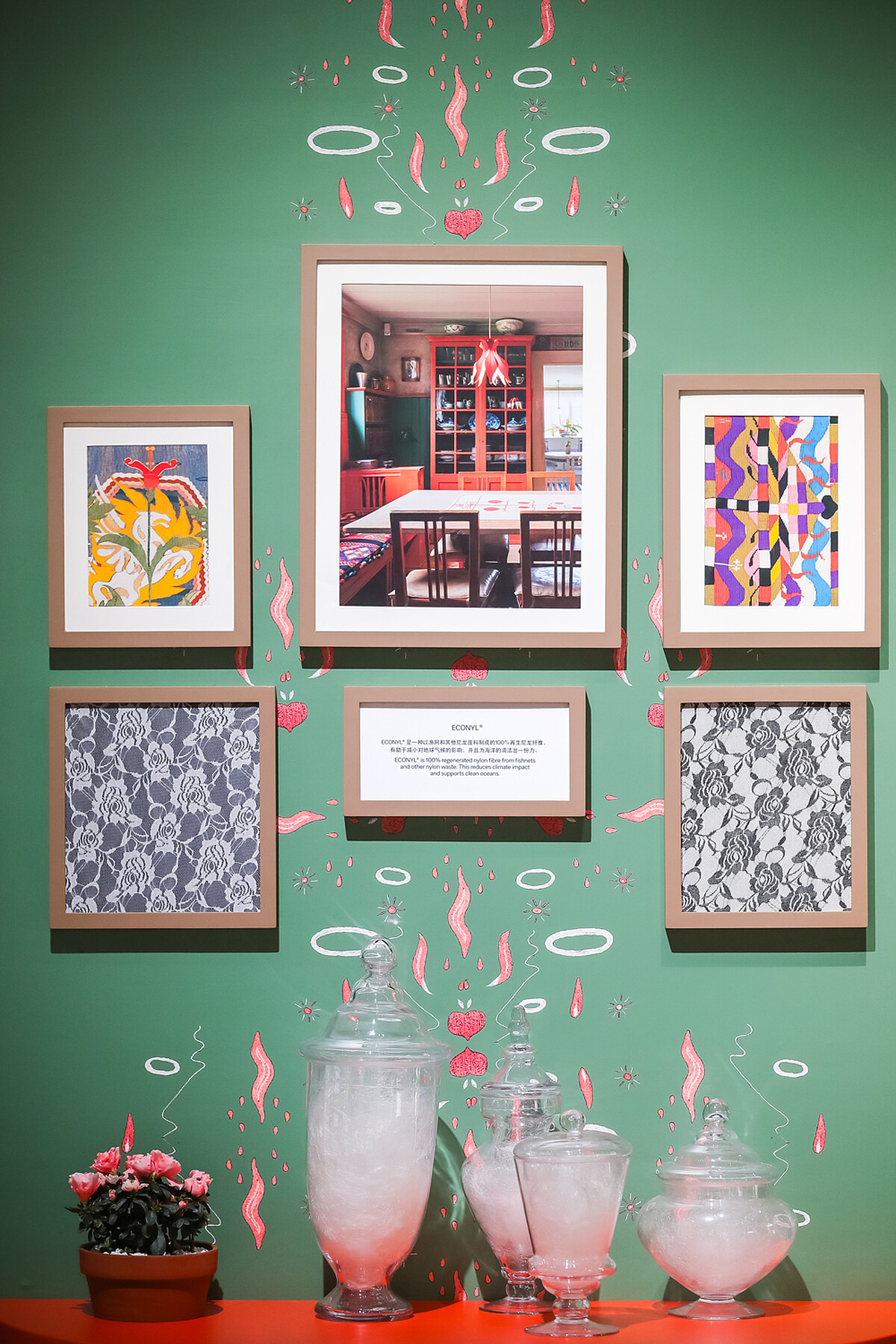 這次 H&M Conscious Exclusive 系列,選定上海拉法耶藝術設計中心舉辦發表會。踏進會場,眾人彷彿穿越時光隧道,來到藝術家 Carl 與 Karin Larsson 充滿創意的瑞典小屋,展覽會場不僅色調繽紛,歷史照片、手繪稿以及歷年與最新 Conscious Exclusive 服裝作品也陳列其中,讓每個角落皆充滿驚喜。