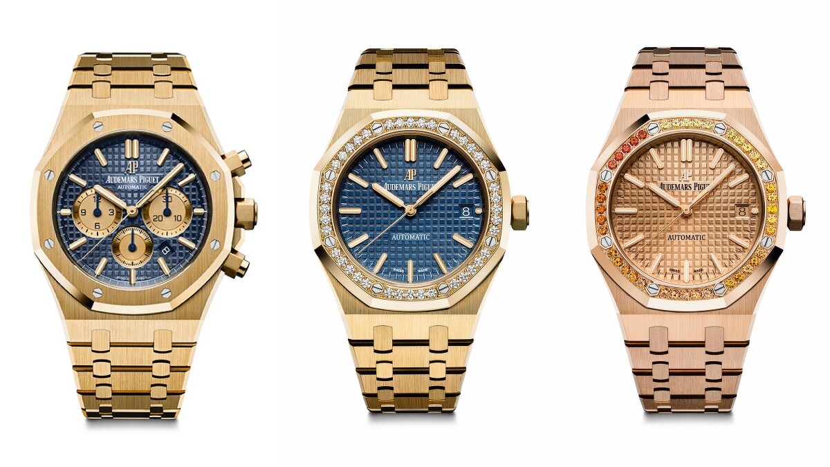 奢華款的皇家橡樹自動上鍊腕錶,擁有金與玫瑰金的錶盤、錶殼、及錶帶作為完美搭配組合:結合了經典時計的黃金錶款,除了有單純素面的錶圈,還有鑲嵌了40 顆圓鑽的璀璨選擇,錶盤則搭配飾有大型格紋裝飾圖案的藍色面,集華麗於大器於一身; 另一款的18K 玫瑰金錶最大的特色在於錶圈上鑲嵌了圓形明亮式切割而成的橙色藍寶石,呈現動人的漸成色彩。