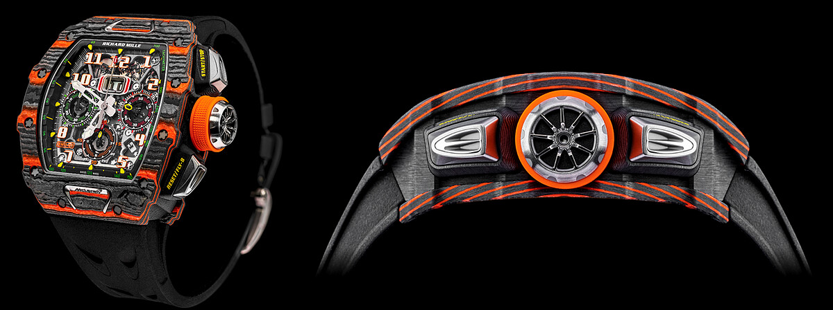 時尚大膽的灰橘配色,連女生也能嗅到運動和科技感的豪華前衛外觀。由RICHARD MILLE工程師Fabrice Namura與McLaren設計總監Rob Melville擷取McLaren 720S超跑元素,應用創新材質和現代工藝的獨特設計!錶殼以RICHARD MILLE獨家的Carbon TPT®碳纖維和橙色TPT®石英纖維材質打造,輕盈且極耐用,也向McLaren標誌配色致敬;上方錶冠和側邊鈦合金按鈕,則呼應McLaren跑車輪圈與720S獨特的車頭燈設計,McLaren的飛鏢廠徽也出現在專屬橡膠錶帶上,無處不在的超跑DNA,彷彿把一輛高級賽車戴在手腕上呀!