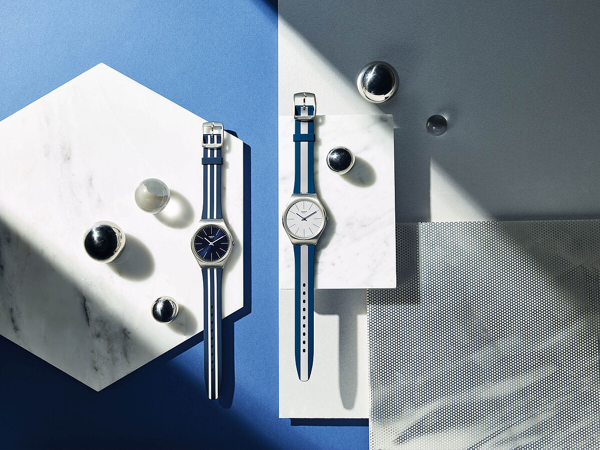 為了呈現清爽的夏日氣息,SKIN超薄系列將大家熟知的航海風---靛藍及白色條紋,以及藍色為基底搭配的白色條紋帶入錶帶設計,為夏日風情增添時尚氣息,而錶盤上的低調光芒則宛如海面上折耀出的璀璨光波 !