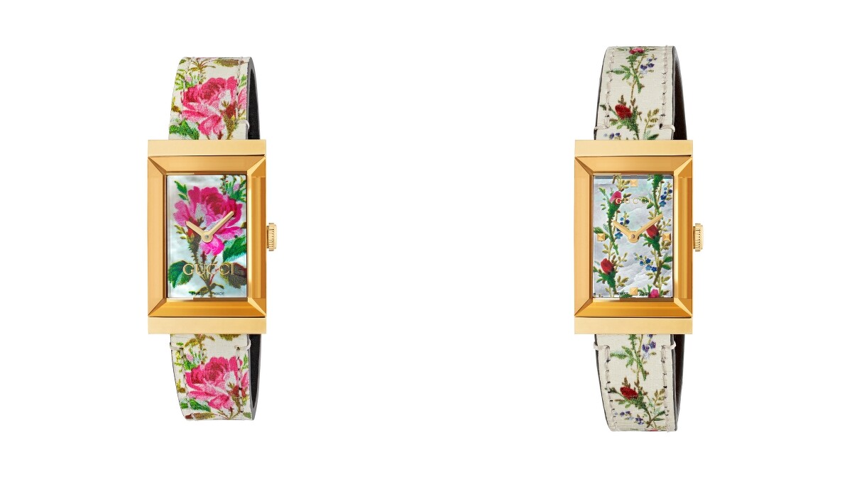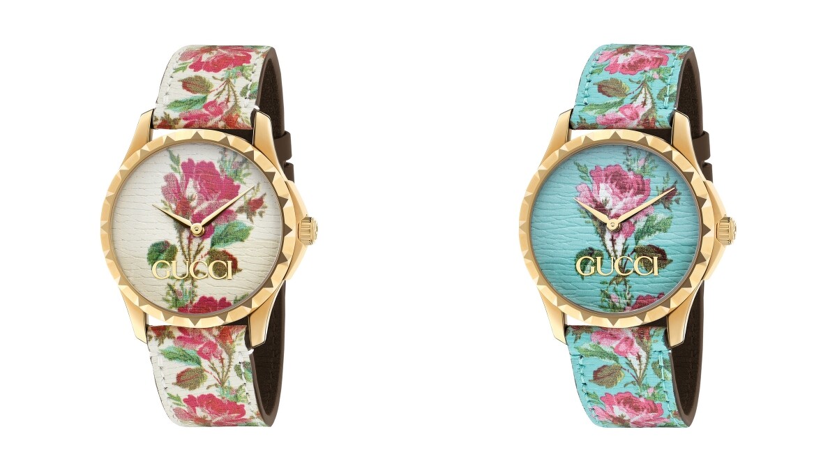 優雅大方的金黃色PVD圓形錶殼上,飾有雕刻細膩的鉚釘,替腕錶增添了不少視覺印象,配上錶盤與錶帶上栩栩如生的花卉彩繪,使整支錶充滿了奢華繁榮的古典美感,六點鐘方向的GUCCI字樣則裝點了大器的氛圍。