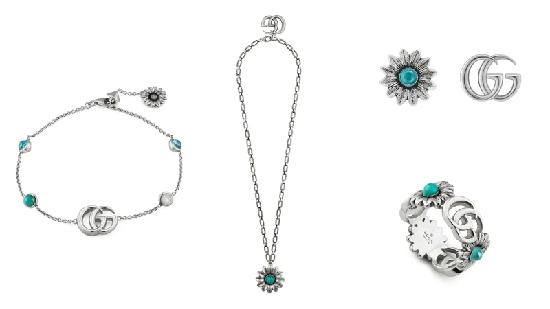 同樣將於七月上市的還有以復古銀處理的GG Marmont系列銀飾,設計上可看見簡約線條的雙G Logo、精緻雕刻的花朵、和裝點於上頭的土耳其藍樹脂雕飾,那滿載中古華麗元素的首飾,絕對會是古典女孩的最愛。